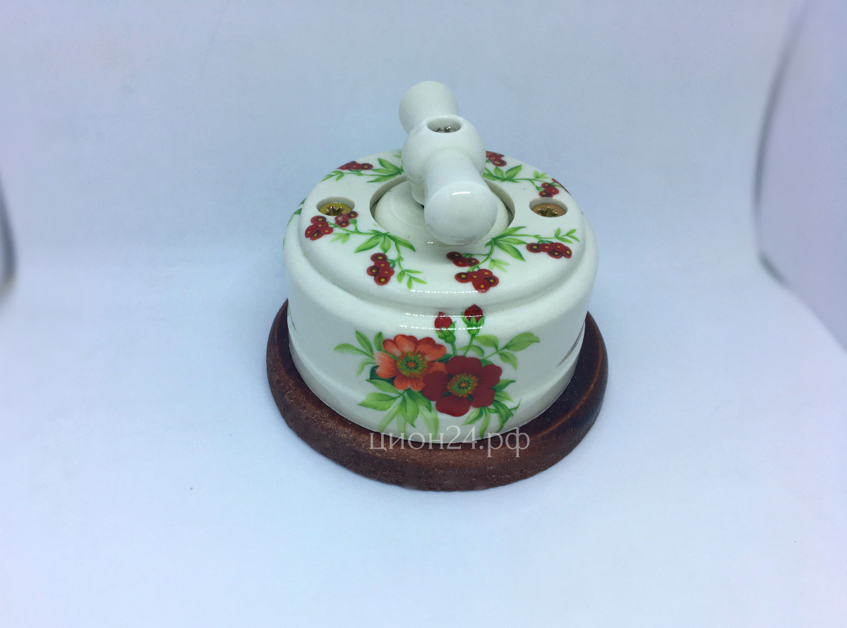 Материал: Корпус - электрофарфор (глазур.). Качественный механизм выключателя выполнен из термостойкого пластика. Подрозетник - дерево (береза крашеная).